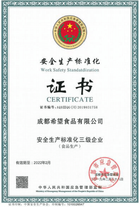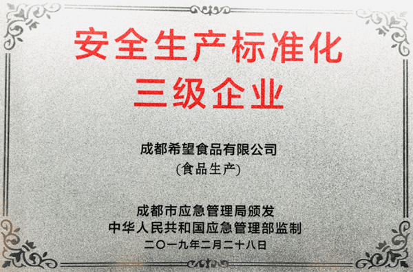 近日,经过成都市应急管理局、新津县应急管理局综合评审,我公司顺利的通过了安全生产标准化三级企业审核,于2019年6月21日获得了由中华人民共和国应急管理部监制、成都市应急管理局授予的“安全生产标准化三级企业”称号,并颁发了证书和铭牌。
